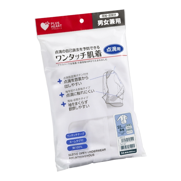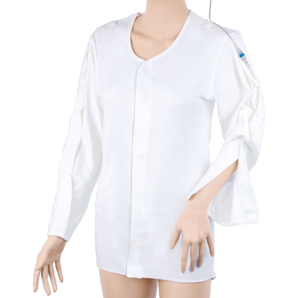 点滴の自己抜去を予防できる、両袖・前開きタイプのワンタッチ肌着です。