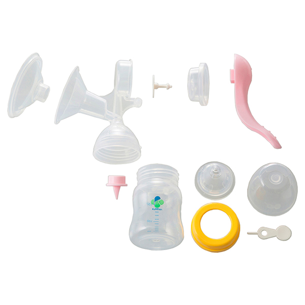 さく乳カップ、シャフト、シリコンポンプ、ハンドル、さく乳カップカバー、逆止弁、哺乳びん(150mL)、乳首(Yカット)、キャップ、フード、お手入れピン