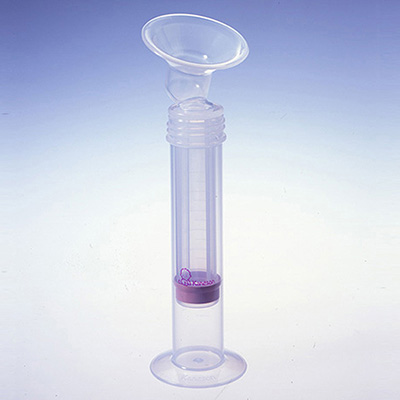 3、ラッパ口を片方の手で乳房にぴったり押し当てます。もう一方の手で、外筒を1-3cm位の長さで、こきざみにゆっくり上下させると、乳頭が引かれ乳汁が分泌されはじめます。(最初の数回は母乳が出ない場合もあります。)