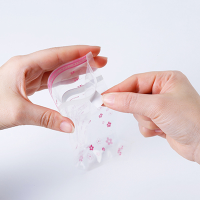 密封方法はヘッダー部分をクルクルッと巻くだけです。シンプルな形状ですから余分な空気も簡単に抜け、密封した状態で保存できます。また口開きも、つまみを引っ張るだけの手軽さです。