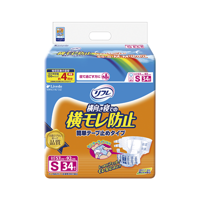 ・横向き寝の横モレ原因を徹底追及したテープタイプの紙オムツです。